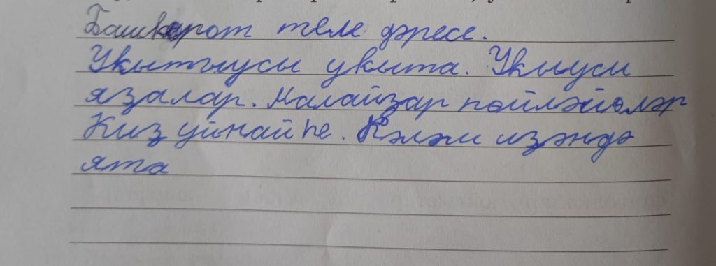 Ҡулланыу өсөн Һүҙҙәр (Слова для употребления): уҡыта – учит, яҙа – пишет, яҙалар – пишут, иҙәндә ята – лежит на полу, һөйләшәләр – разговаривают, уйнай – играет.