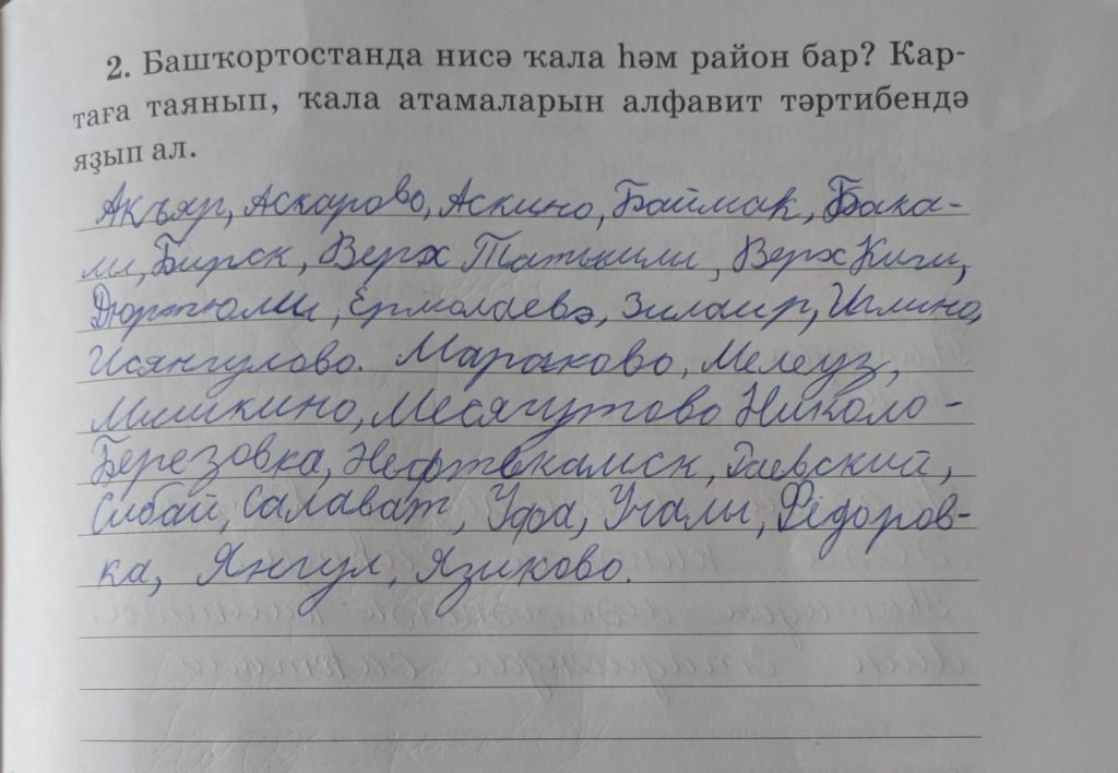 3-сө дәрес (урок 3 страница 7) 2. Башңортостанда нисә ҡала һәм район бар? Картаға таянып, ҡала атамаларын алфавит тәртибендә яҙып ал.