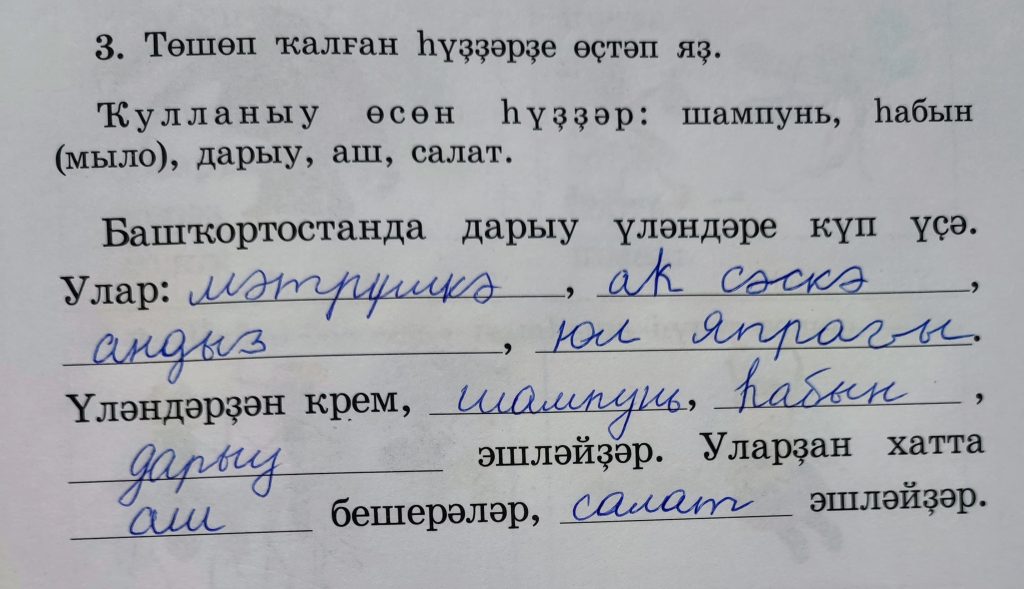 Ҡулланыу өсөн Һүҙҙәр: шампунь, һабын (мыло), дарыу (лекарство), аш (суп), салат.