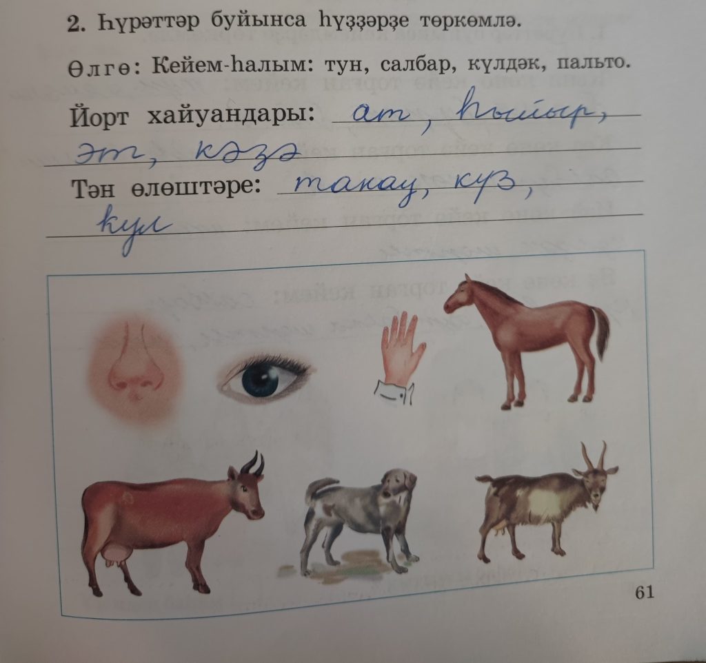 Йорт хайуандары (Домашние животные): ат (лошадь), һыйыр (корова), эт (собака), кәзә (коза).