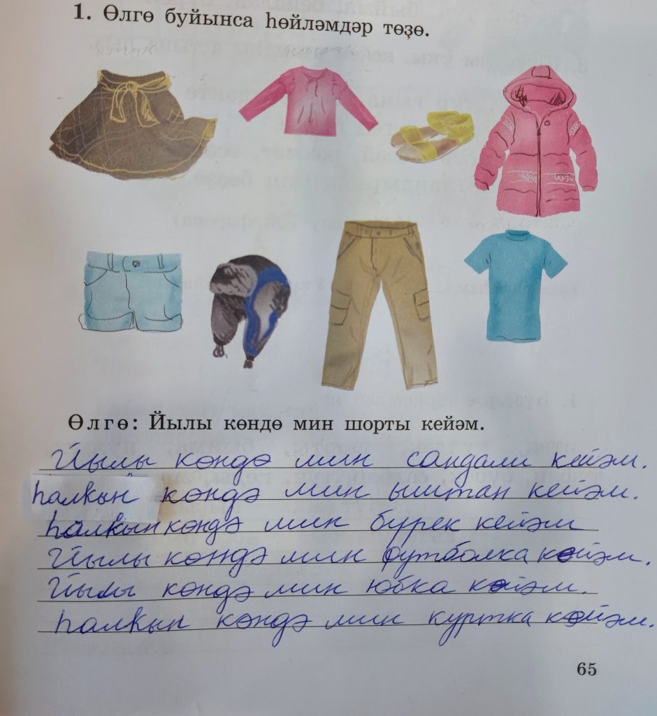 Өлгө: Йылы көндө мин шорты кейәм. (Пример: В теплый день я шорты надеваю.)
