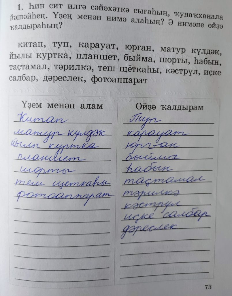 52-се дәрес (урок 52 страница 73) 1. Һин сит илгә сәйәхәткә сығаһын, ҡунаҡханала йәшәйһең. Үҙең менән нимә алаһың? Ә нимәне өйҙә ҡалдырыһың?