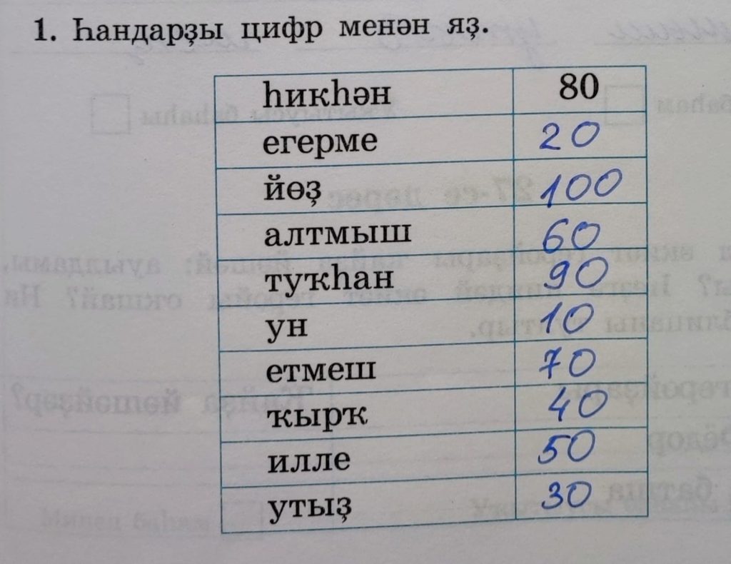 һикһән – восемьдесят, егерме – двадцать, йәҙ – сто, алтмыш – шестьдесят, туҡһан – девяносто, ун – десять, етмеш – семьдесят, ҡырҡ – сорок, илле – пятьдесят, утыҙ – тридцать.
