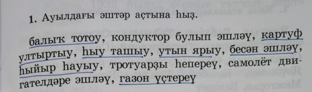 балыҡ тотоу (рыбная ловля), кондуктор булып (кондуктором работать), картуф ултыртыу (картошку сажать), һыу ташыу (воду носить), утын ярыу (дрова рубить), бесән эшләү (сено заготавливать), һыйыр һауыу (корову доить), тротуарҙы һепереү (тротуар подметать), самолёт двигателдәре эшләү (делать самолетные двигатели), газон үҫтереү (газон выращивать).