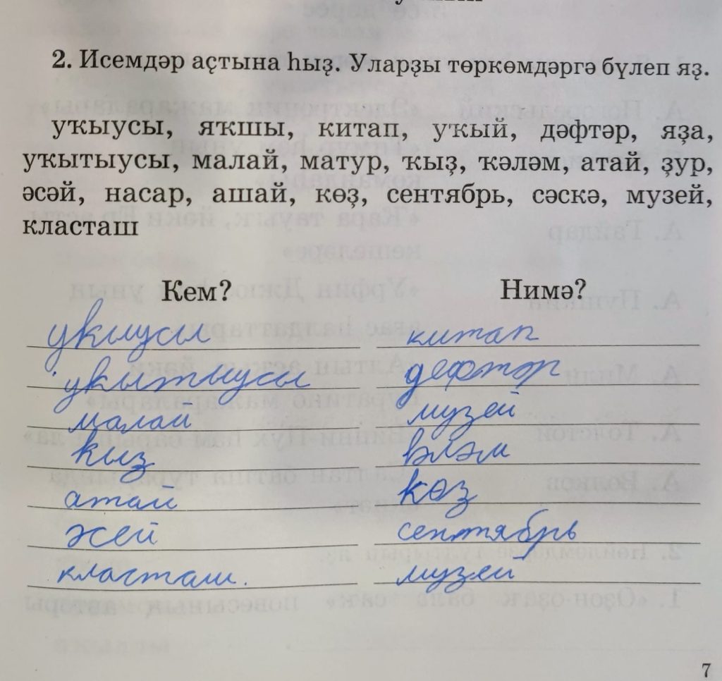 4-се дәрес (урок 4 страница 7) 2. Исемдәр аҫтына һыҙ. Уларҙы төркөмдәргә бүлеп яҙ.
