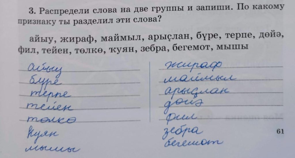 49-сы дәрес (урок 49 страница 61) 3. Распредели слова на две группы и запиши. По какому признаку ты разделил эти слова?