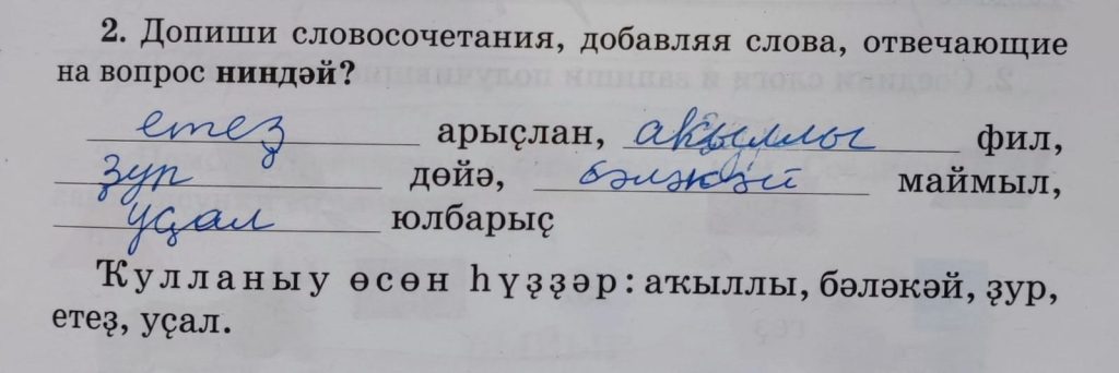 51-се дәрес (урок 51 страница 65) 2. Допиши словосочетания, добавляя слова, отвечающие на вопрос ниндәй?