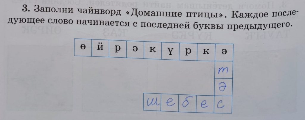 55-се дәрес (урок 55 страница 70) 3. Заполни чайнворд “Домашние пттицы”. Каждое последующее слово начинается с последней буквы предыдущего.