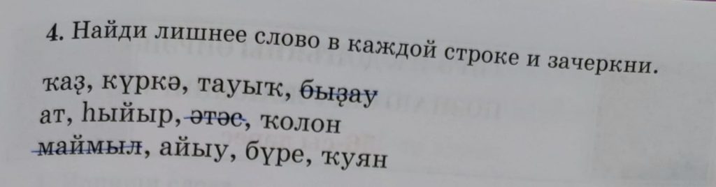 55-се дәрес (урок 55 страница 71) 4. Найди лишнее слово в каждой строке и зачеркни.