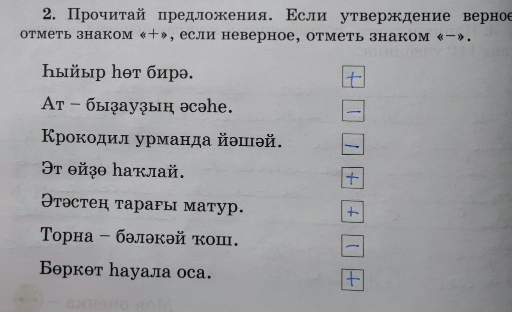 60-сы дәрес (урок 60 страница 78) 2. Прочитай предложения. Если утверждение верное, отметь знаком “+”, если неверное, отметь знаком “-“.
