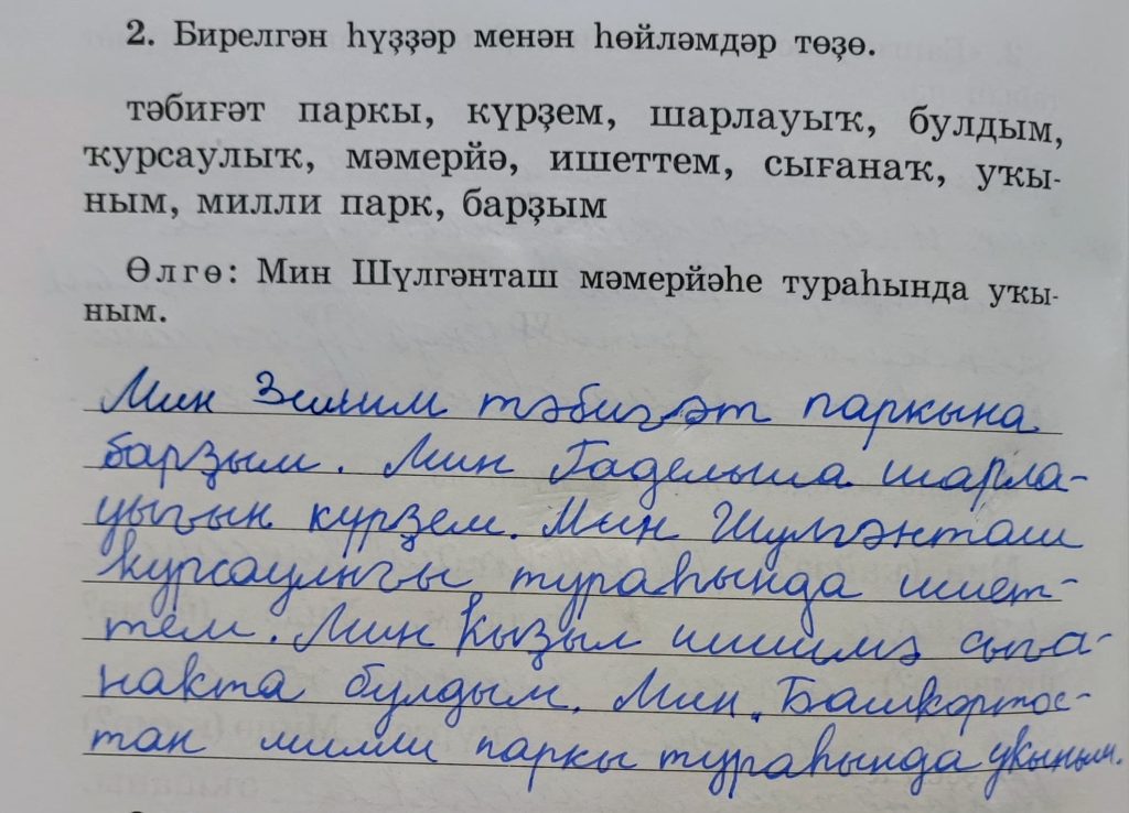 Мин Зилим тәбиғәт паркына барҙым. (Я ездил в природный парк Залим.) Мин Гадельша шарлауығын күрҙем. (Я видел водопад водопад Гадельша.) Мин Шүлгәнташ ҡурсаулығы тураһында ишеттем. (Я слышал про заповедник Шульганташ.) Мин Ҡыҙыл шишмә сығанаҡта булдым. (Я был на источнике Красный Ключ.) Мин “Башҡортостан” милли паркы тураһында уҡыным. (Я читал о национальном парке “Башкортостан”.)