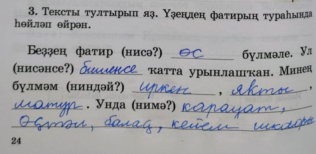 16-сы дәрес (урок 16 страница 24) 3. Тексты тултырып яҙ. Үҙеңдең фатирың тураһында һөйләп өйрән.