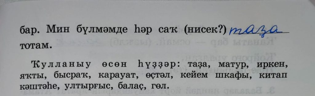 Ҡулланыу өсөн һүҙҙәр: таҙа, матур, иркен, яҡты, бысраҡ, карауат, өҫтәл, кейем шкафы, китап кәштәһе, ултырғыс, балаҫ, гөл. Слова для использования: чистый, красивый, просторный, светлый, грязный, кровать, стол, шкаф для одежды, книжная полка, стул, ковер, цветок.