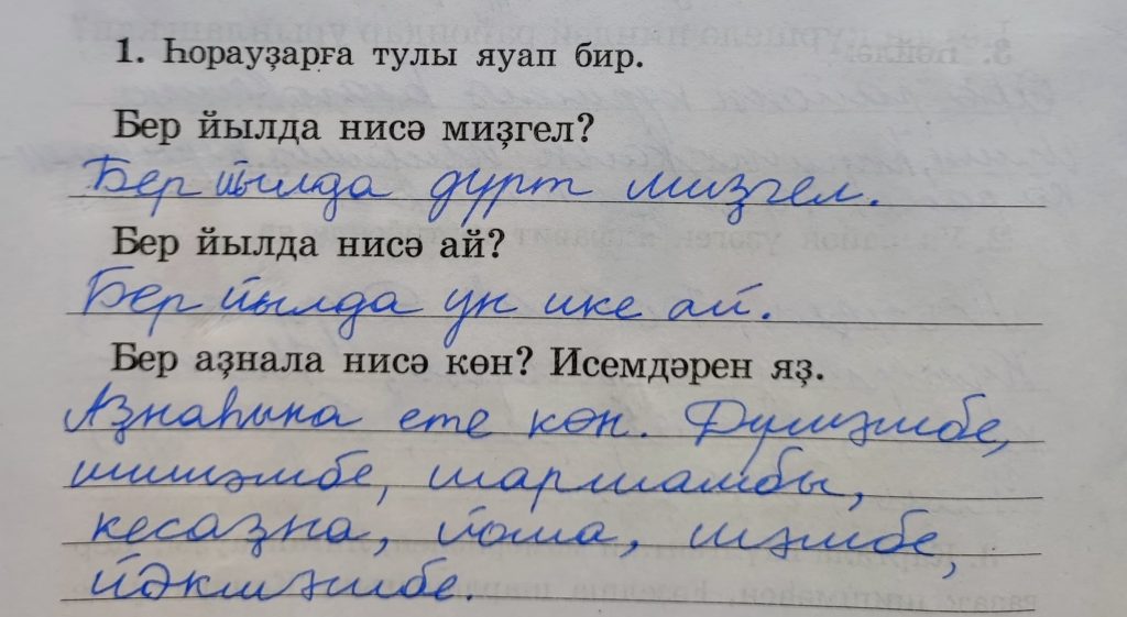 Бер аҙнала нисә көн? Исемдәрен яҙ. (Сколько дней в неделе? Напишите названия.) Аҙнаһына ете көн. Дүшәмбе, шишәмбе, шаршамбы, кесаҙна, йома, шәмбе, йәкшәмбе. (В неделе семь дней. Понедельник, вторник, среда, четверг, пятница, суббота, воскресенье.)