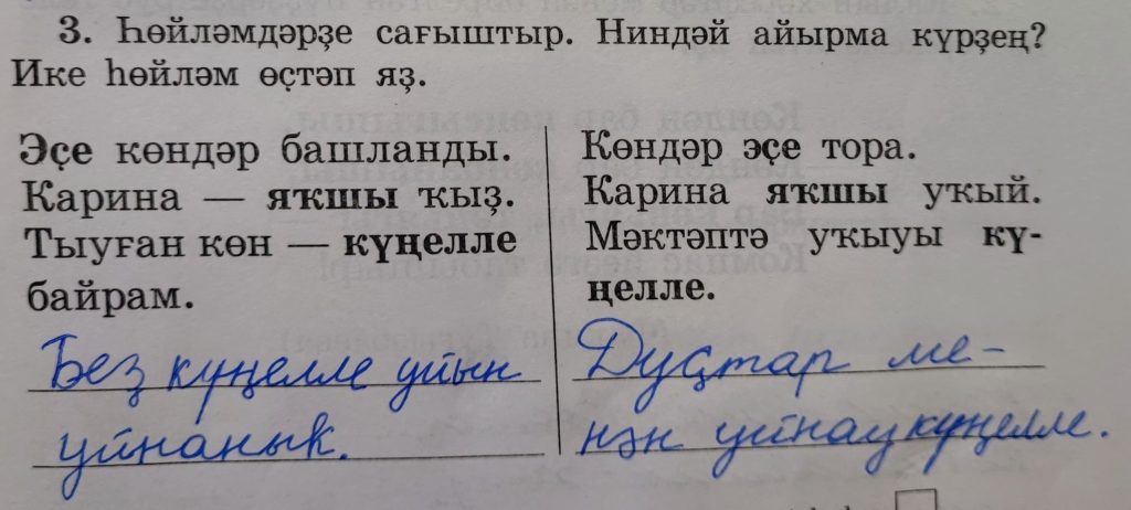 | Эҫе көндәр башланды. (Жаркие дни начались). Карина – яҡшы ҡыз. (Карина – хорошая девочка). Тыуған көн – күңелле байрам. (День рождения – веселый праздник.) | Көндәр эҫе тора. (Дни жаркие стоят). Карина яҡшы уҡый. (Карина хорошо учится) Мәктәптә уҡыуы күңелле. (Учиться в школе весело.) |