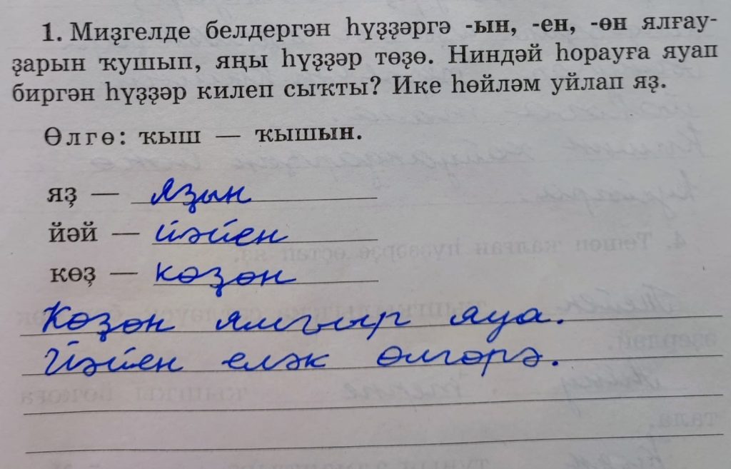 Көҙөн ямғыр яуа. (Осенью идет дождь). Йәйен еләк өлгөрә. (Летом ягоды поспевают).