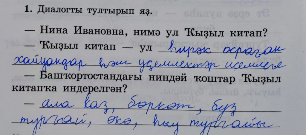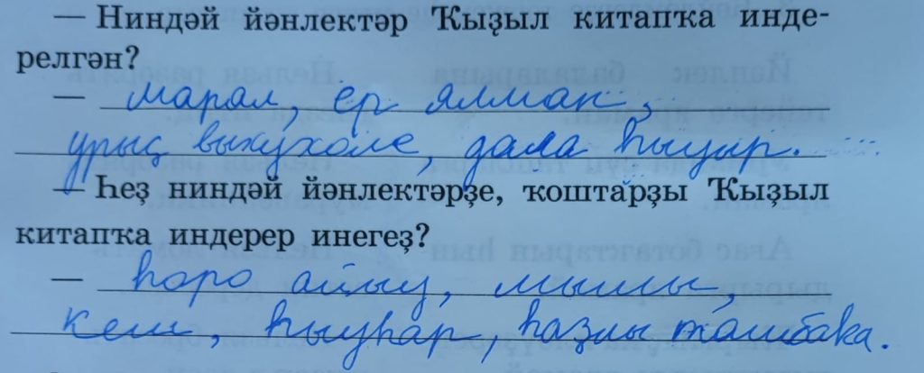 -Ҡыҙыл китап – ул һирәк осраған  хайуандар һәм үҫемлектәр исемлеге. (Красная книга – это список редких животных и растений.)