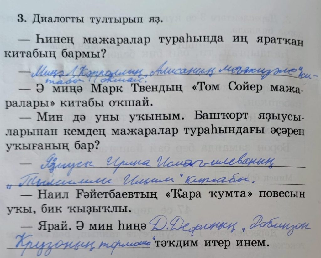 – Мин дә уны уҡыным. Башҡорт яҙыусыларынан кемдең мажаралар тураһындағы әҫәрен уҡығаның бар? (Я его тоже читал. Башкирских писателей произведения о приключениях какие ты читал?)