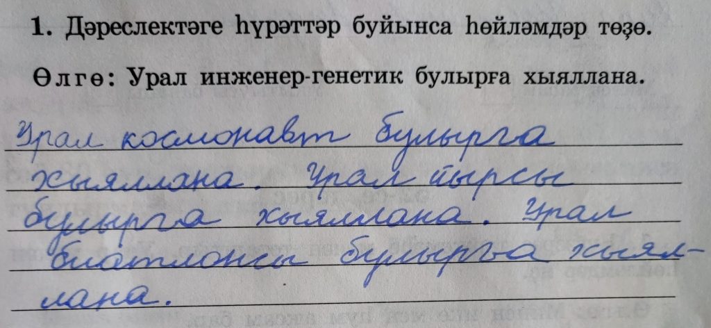 Өлгө: Урал инженер-генетик булырға хыяллана. . (Урал мечтает стать инженером-генетиком).