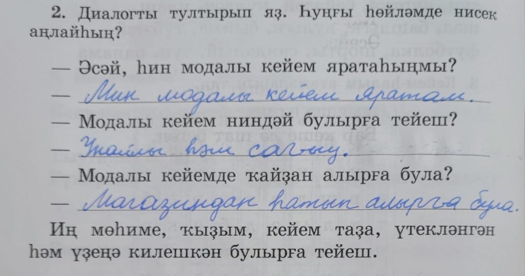 – Әсәй, һин модалы кейем яратаһыңмы? (Мама, ты модную одежду любишь?)